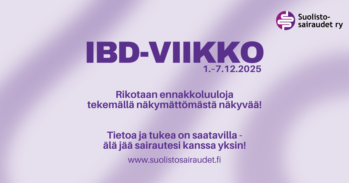 Kansainvälistä IBD-viikkoa vietetään 1.–7.12. Viikon tarkoituksena on nostaa tulehdukselliset suolistosairaudet esille niin sosiaalisessa kuin perinteisessäkin mediassa, jotta IBD:tä ja sen vaikutuksia elämään ymmärrettäisiin paremmin.