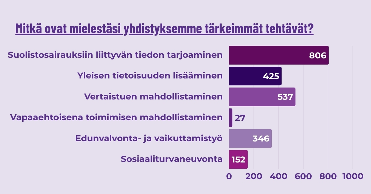 Jäsenkysely osoitti, että työmme suolistosairautta sairastavien eduksi on strategiamme mukaisella suunnalla. Kyselyn palautteet, toiveet sekä kiitokset ovat arvokasta antia, joka vie meitä yhdessä eteenpäin.