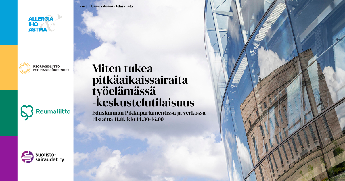 Suolistosairaudet ry, Allergia-, Iho- ja Astmaliitto, Psoriasisliitto sekä Reumaliitto järjestävät yhteistyössä kaikille avoimen keskustelutilaisuuden tiistaina 11.11.2025 klo 14.30–16.00 eduskunnan kansalaisinfossa osoitteessa Arkadiankatu 3. Tervetuloa paikan päälle kuuntelemaan ja keskustelemaan! Tilaisuuteen voi osallistua myös etäyhteydellä.