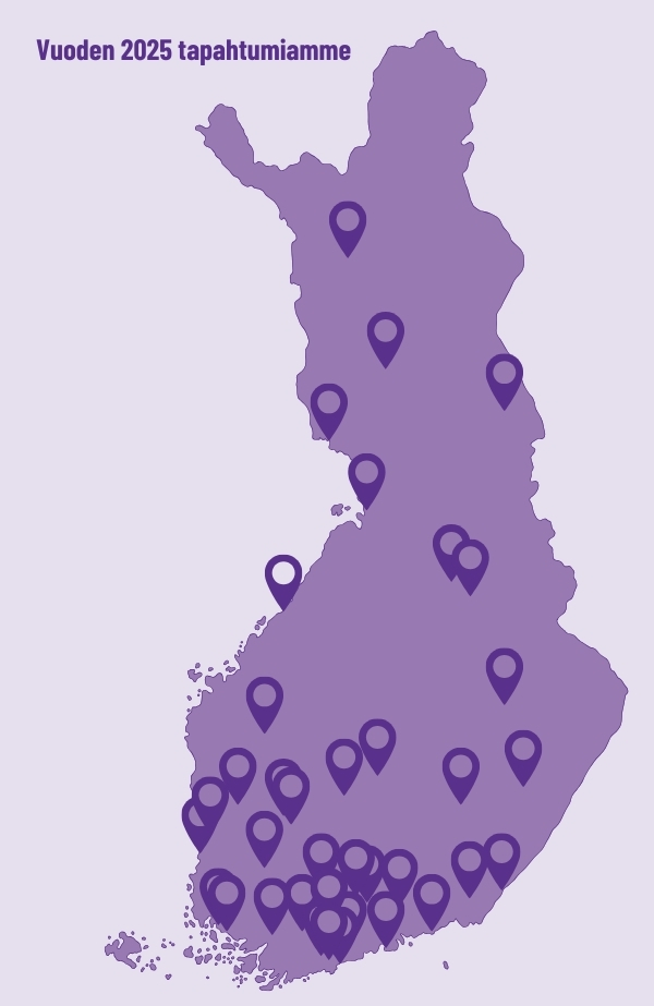 Vuoden 2025 aikana järjestimme toimintaa yli 40 paikkakunnalla ympäri Suomen! Me todella olemme valtakunnallisesti toimiva järjestö, mutta Suomen kartalle osuu yhä katvealueita. Kasvavan ja yhä kattavamman vertaistuen mahdollistamiseksi tarvitsemme kenties juuri sinua!