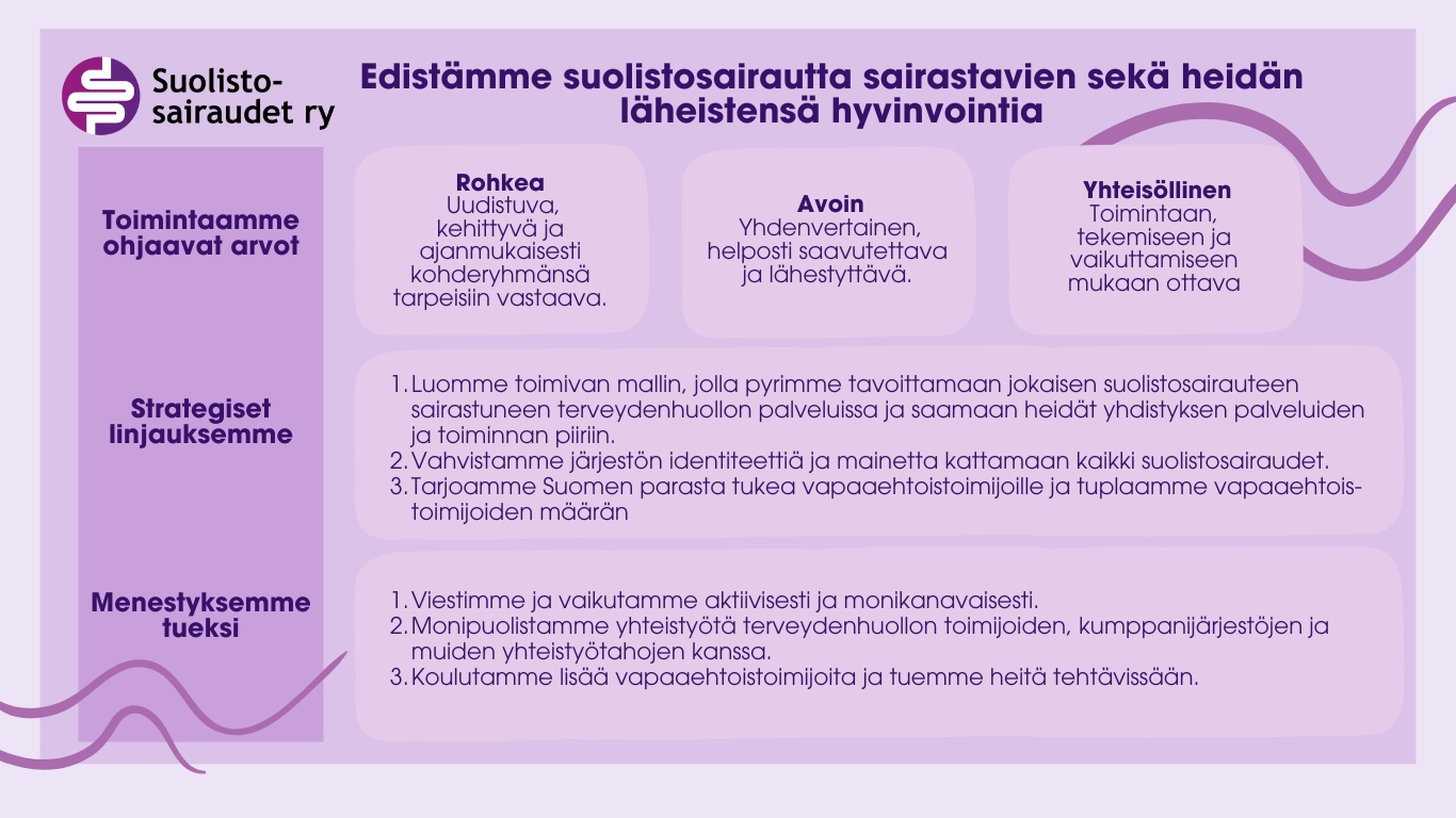 - Luomme toimivan mallin, jolla pyrimme tavoittamaan jokaisen suolistosairauteen sairastuneen terveydenhuollon palveluissa ja saamaan heidät yhdistyksen palveluiden ja toiminnan piiriin